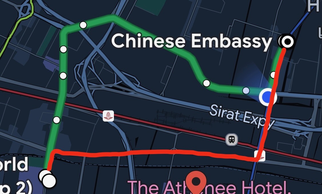 公交最硬核,是人工售票,而且售票员一般不懂英语,乘客里也大部分是本地人,交流很困难,建议不要尝试。我们最后一天晚上在 centralwOrld 附近因为人太多太堵打不到车,就按照 Google Maps 公交导航坐上了一辆公交车。经过一番困难的沟通买了票后,发现走的不是 Google Maps 上的路线,就决定继续坐到大方向偏离的时候再下来打车。所幸虽然路线不一样,最终还是到了我们住处附近。