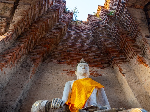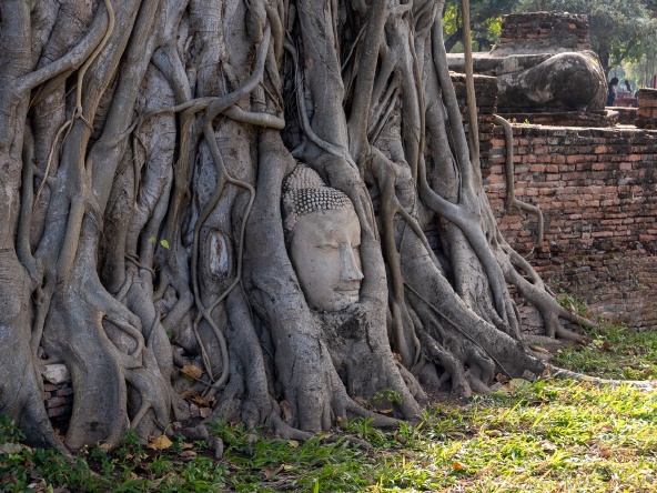 缅甸军入侵的时候把玛哈泰寺的佛首都砍下,有一颗滚到了无花树的根部,多年后就形成了「树中佛」。