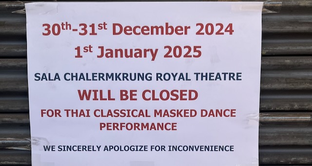 大皇宫门票除了包含和皇宫在一起的另外两个景点,还包括观看泰国传统的面具舞(只有周末有)。因为剧院在另一个地方,所以在皇宫出口对面有一个集合点可以等大巴接送,按照牌子上的说法是 15 分钟一辆车。我们和一些其他游客一起等了很长时间也没见车,就决定直接走过去。在下午的炙热中走了 20 多分钟后,看到剧院门口贴着一张纸说这几天关门。沟通非常不靠谱,应该在大部分人等车的地方贴个通知。